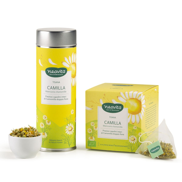 Pezzi di mela, fiori di camomilla, frutti di rosa canina, foglie di verbena, frutti di ribes nero, petali di fiori di arancio, fiori di tiglio, petali di fiordaliso
